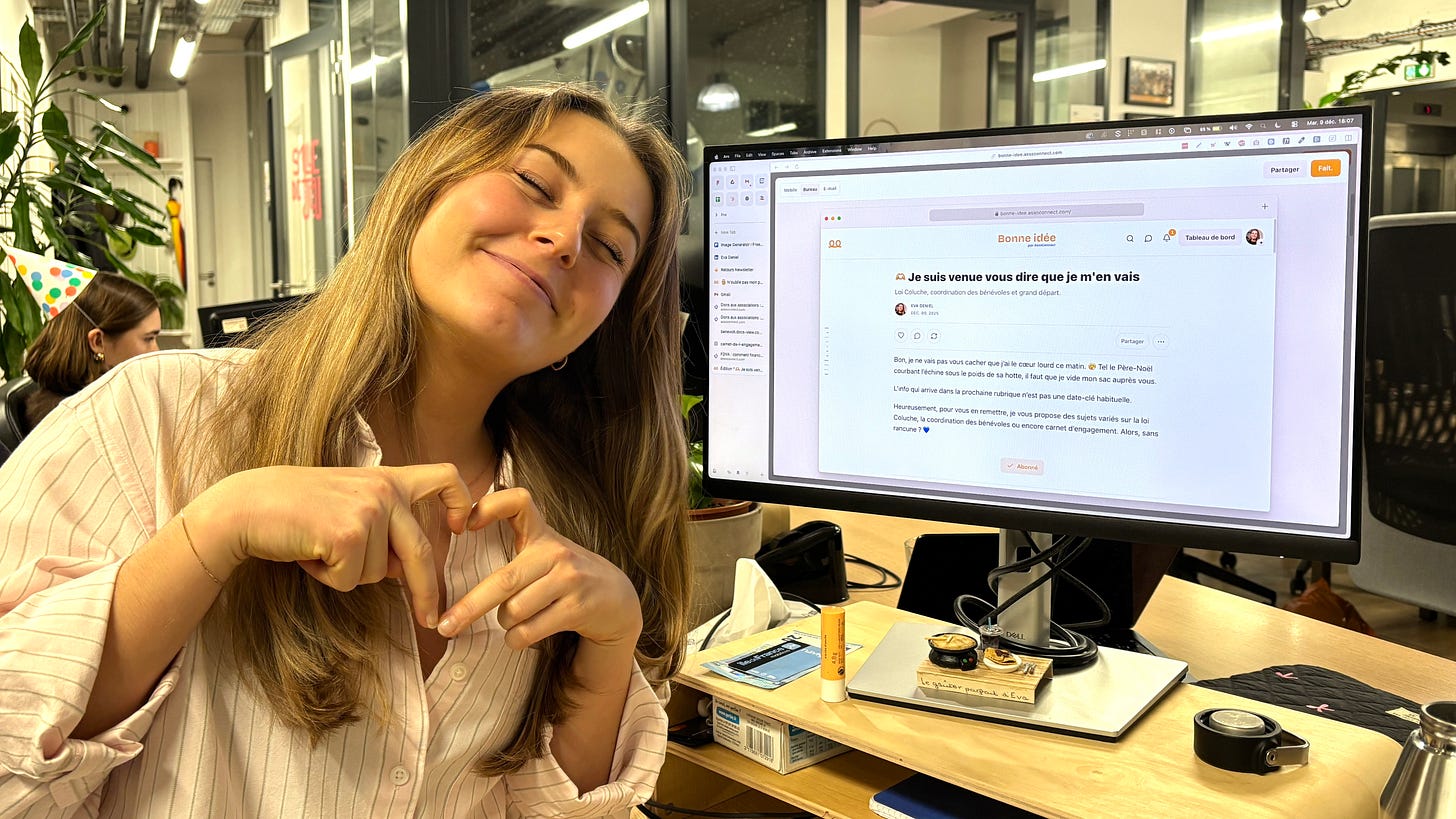 Cette newsletter, câĂ©tait le rendez-vous hebdomadaire que jâabordais avec un enthousiasme intact. Chaque mercredi matin, jâĂ©tais impatiente de lire vos messages, de discuter avec vous. Marie-AndrĂ©e, Philippe, RenĂ©e, Julien, Sophie, Maryse⊠Vous ĂȘtes plus de 25 000 Ă ouvrir ce mail chaque semaine ! Câest fou. Merci pour votre fidĂ©litĂ©. Jâemporte avec moi votre gentillesse, vos boutades, et votre gĂ©nĂ©rositĂ© sans faille. Vous avez rendu le secteur associatif trĂšs cher Ă mon cĆur.